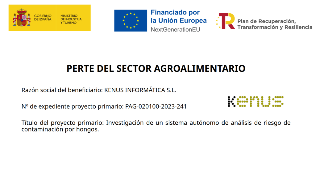 Hemos recibido una ayuda del Ministerio de Industria y Turismo, Financiada con fondes NextGenerationEU de la UE en el ámbito del Plan de Recuperación, Transoformación y Resiliencia por la participación en un proyecto de desarrollo para el análisis de riesgo de contaminación por hongos.